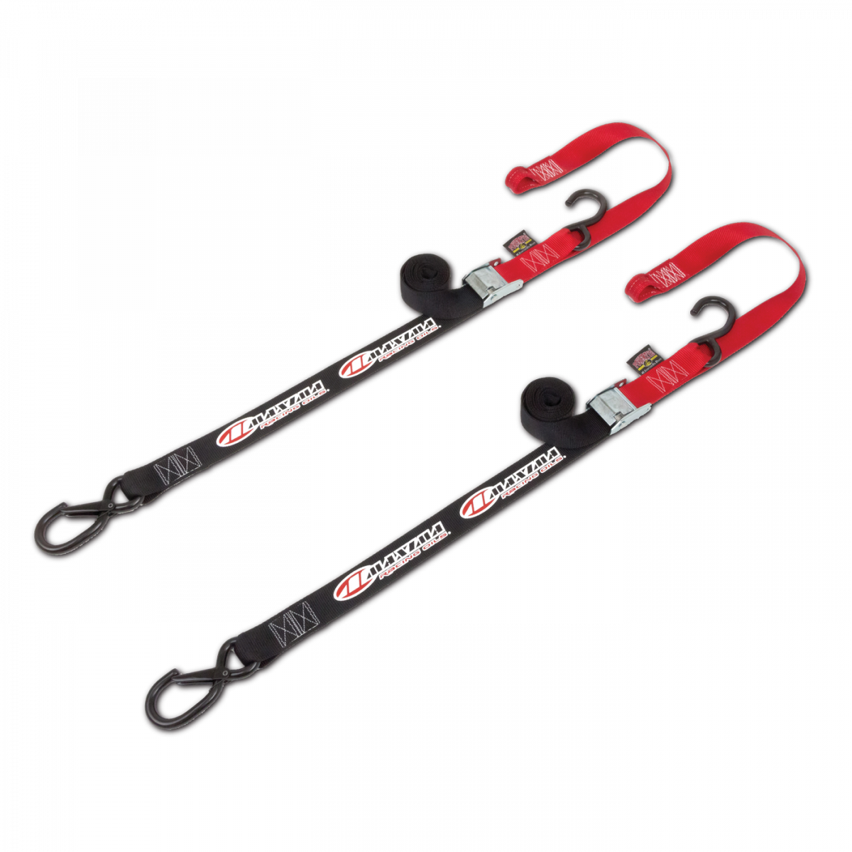 SIZE: 1.5(W) x 6'(L) WITH SOFT-TIE AND CARABINER Maxima Tie-Downs are built to last with double-stitched nylon webbing and a 600lb working load limit. The non-abrasive nylon material prevents scratching of painted or plastic surfaces. The industrial strength buckle with self-closing design keeps your ride safe and secure. Each pack includes two tie-downs, available in red or black.